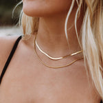 O Colar Duplo Layered Namoour une duas correntes icônicas em um design sofisticado e atemporal: a força da gargantilha Snake dourada e a delicadeza da corrente torcida de comprimento médio.