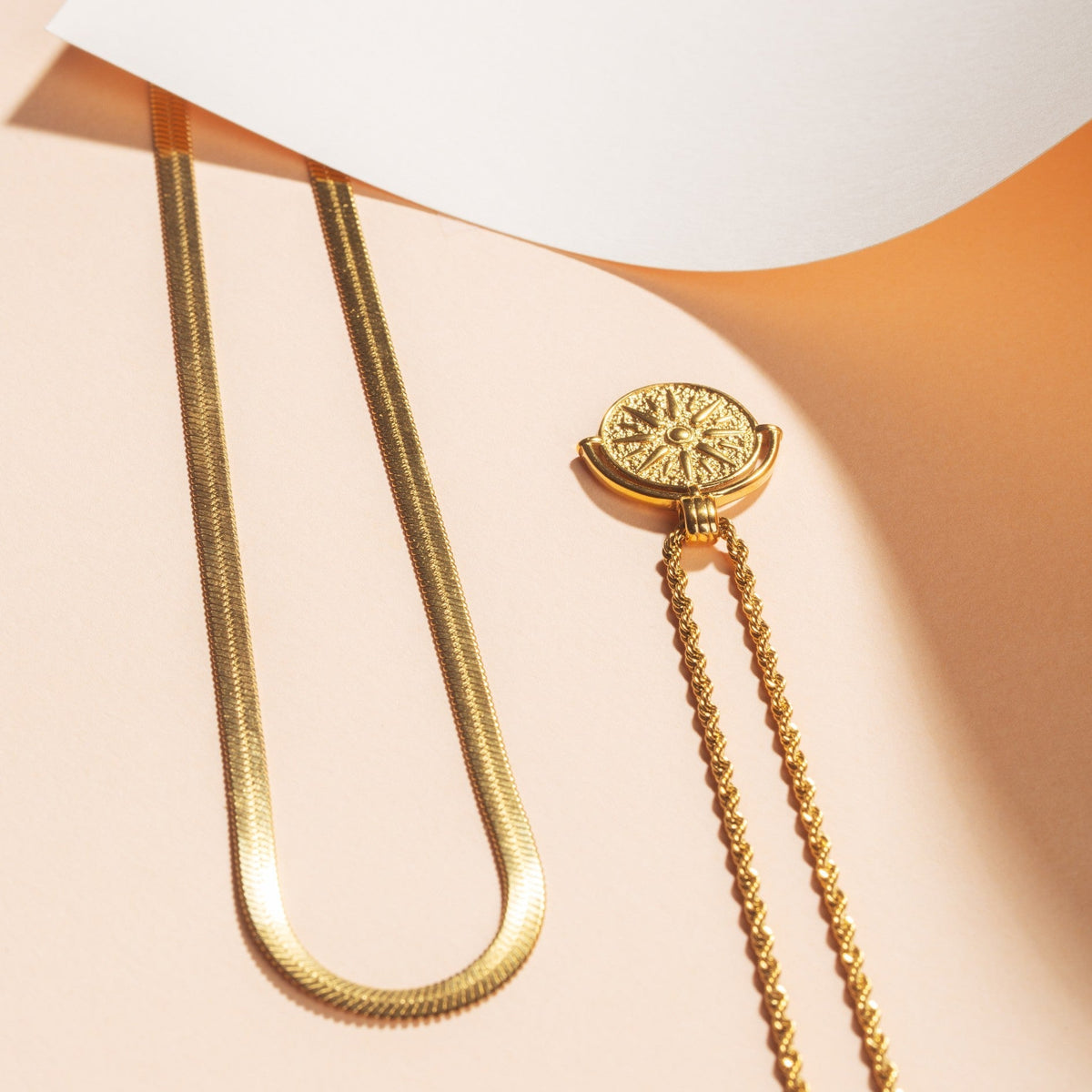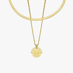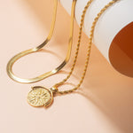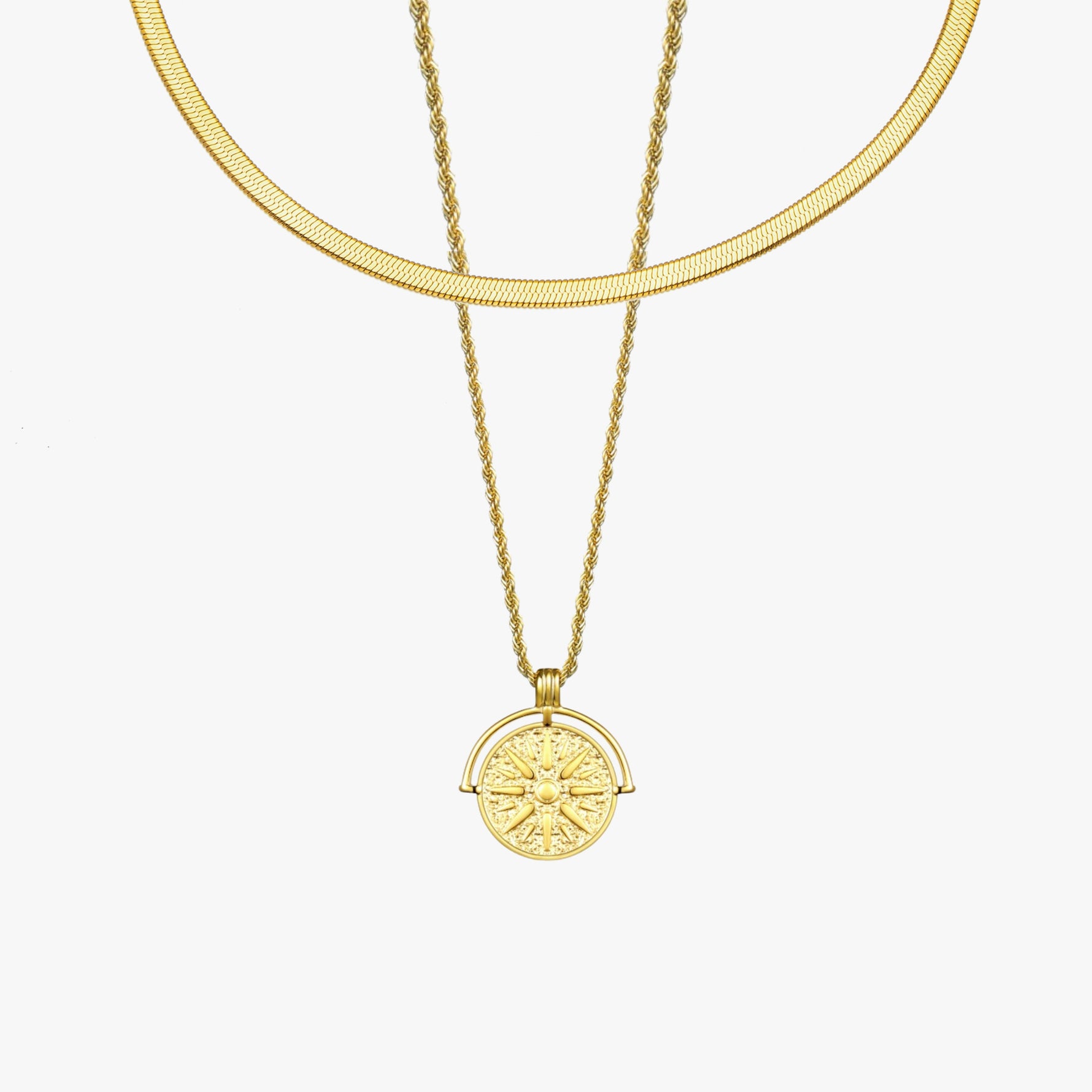O conjunto inclui 2 peças: Gargantilha Espinha de Peixe + Colar Sol Dourado